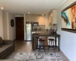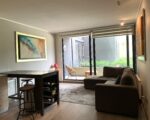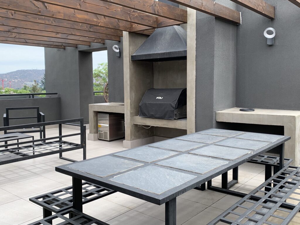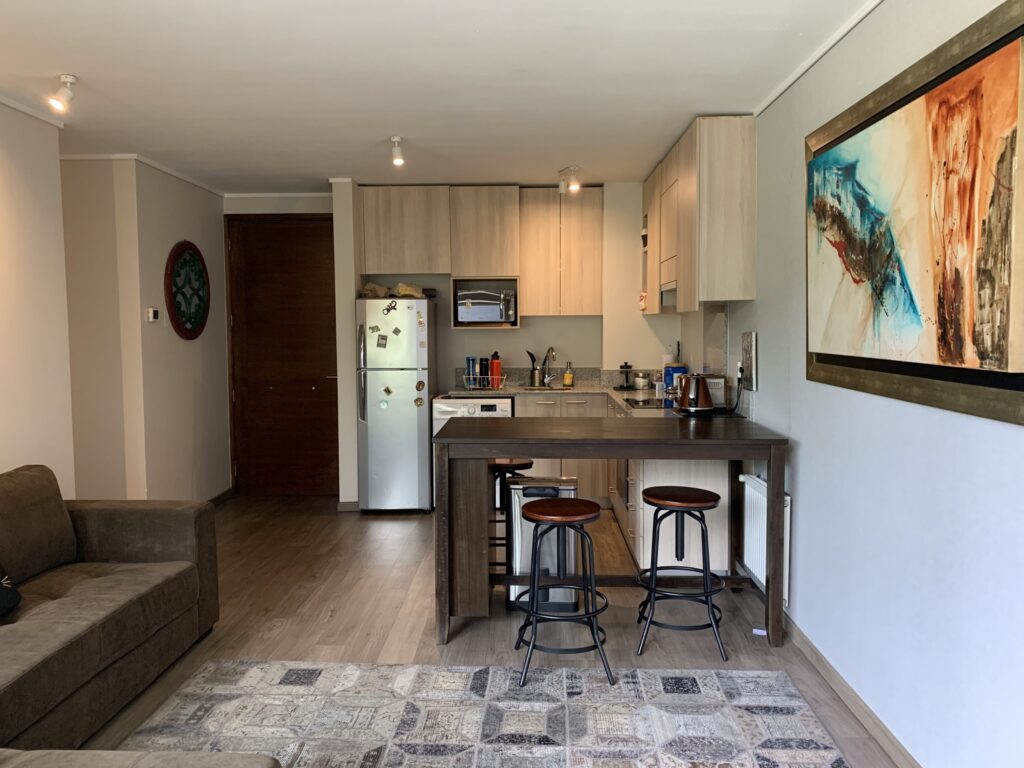 - Cocina integrada completamente amoblada y equipada con mesones de granito gris, horno empotrado, encimera de 4 platos, campana retráctil, lavadora y refrigerador instalados.
