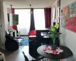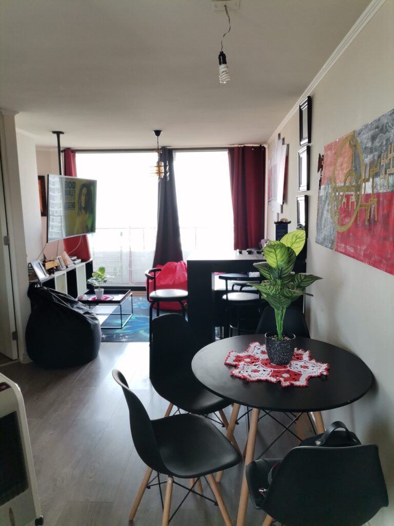 - Cocina americana completamente amoblada y equipada con mesones de melamina blanco, horno empotrado, encimera de 2 platos, campana, conexión para lavadora.